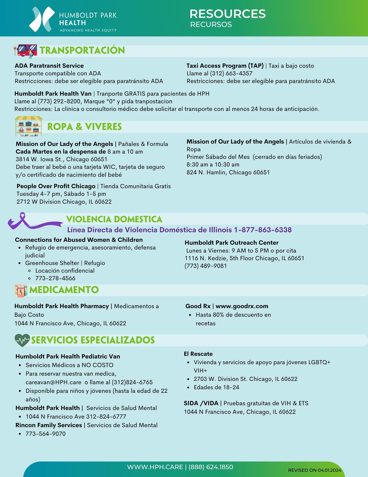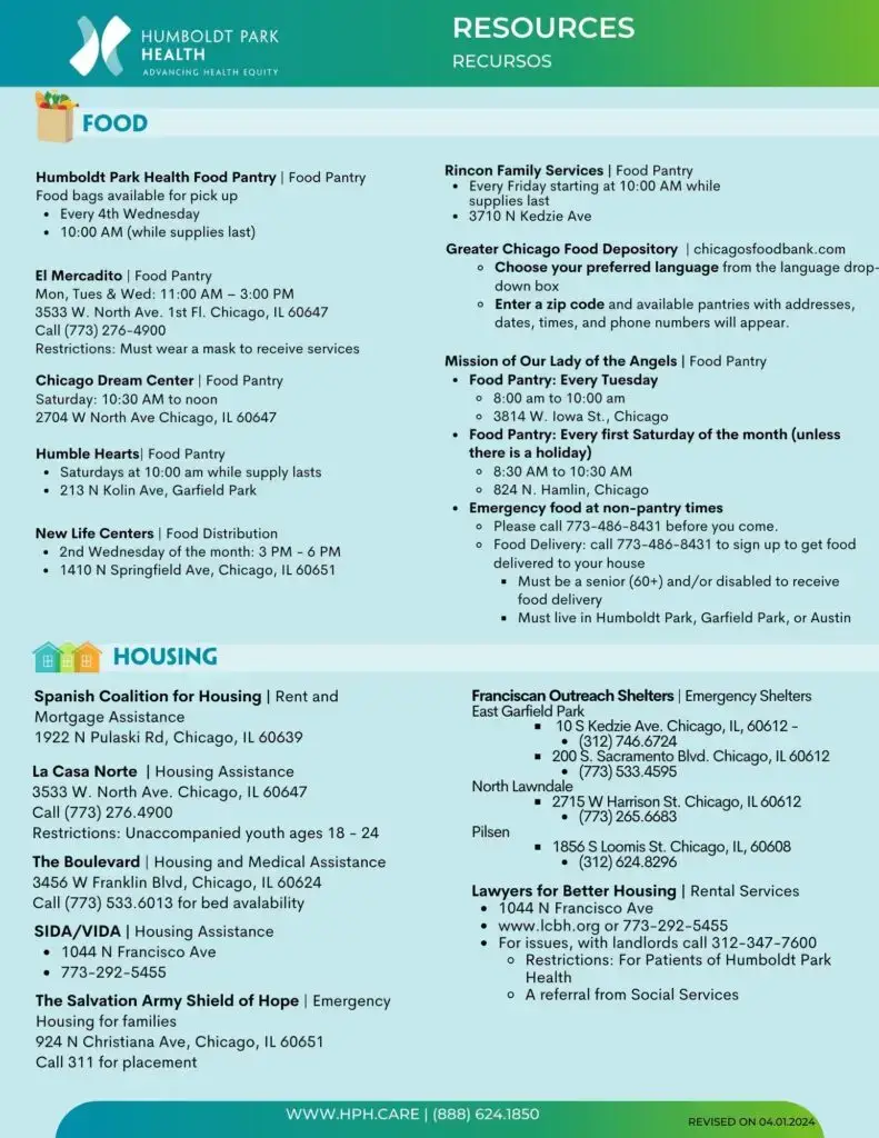 Para seguir brindando atención médica de calidad, Humboldt Park Health desarrolló un documento de una página que proporciona recursos valiosos para ayudar a individuos y familias en la comunidad de Humboldt Park y sus alrededores.
