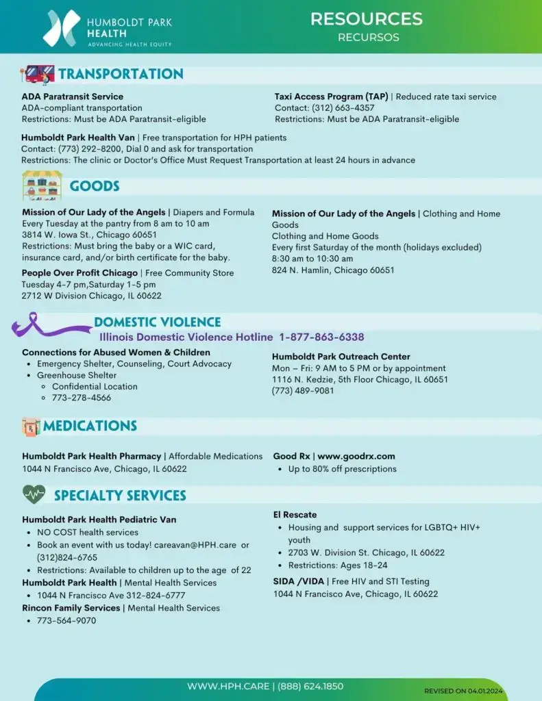 To continue providing quality patient care, Humboldt Park Health developed a one-page document that provides valuable resources to help individuals and families in the Humboldt Park community and its surrounding.